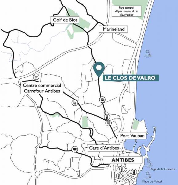 La résidence Le Clos de Valro sera construite à Antibes, commune très prisée de la Côte d'Azur. La résidence Le Clos de Valro bénéficiera d'un emplacement de choix à proximité de toutes les commodités du quotient (commerces, écoles, loisirs, axes de transport...) à quelques minutes du célèbre Port Vauban, du vieil Antibes et des plages ainsi que des grands axes desservant les principales agglomérations du département.